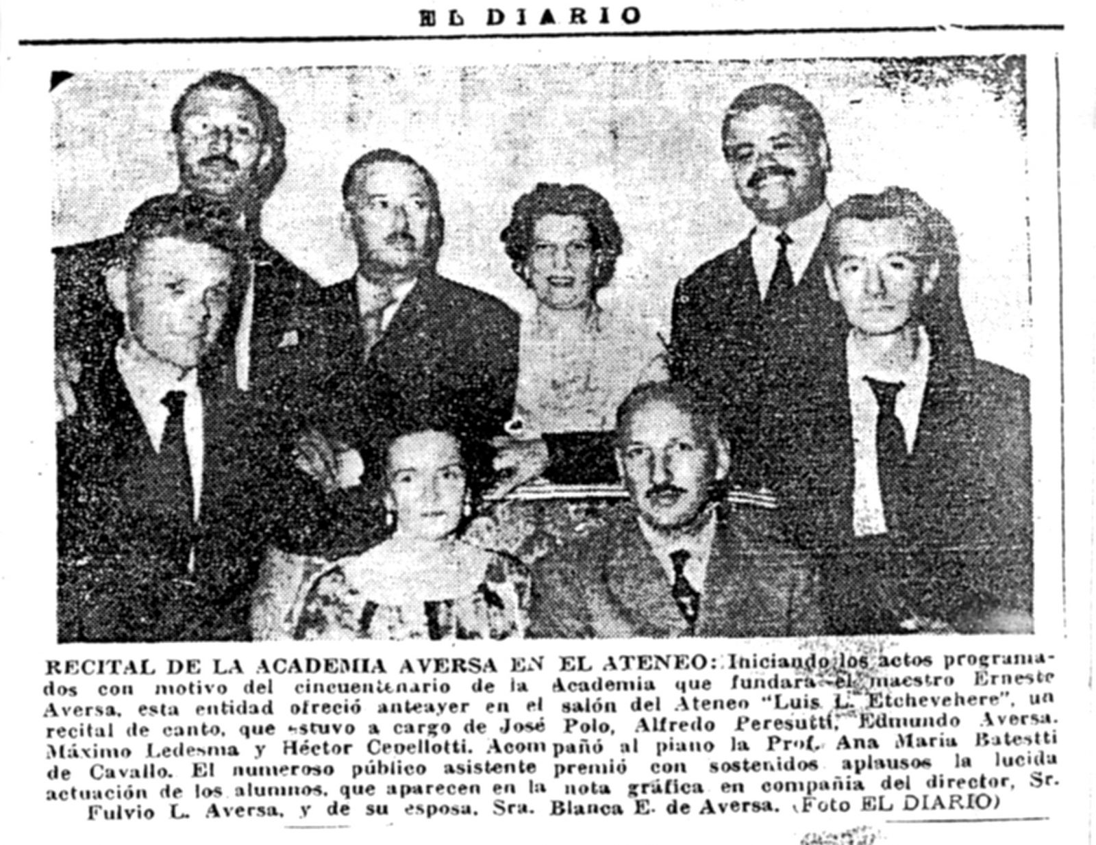 Por su parte Elio Leyes comentaba su experiencia de niño: “Sé que por estos días se va a rendir un homenaje a la memoria de Don Ernesto Aversa. Me asocio a él de todo corazón. Cuando niños, siendo profesor de música en la Escuela Centenario, supo formarnos el gusto artístico haciéndonos cantar trozos de óperas y lindas canciones que todavía, a pesar de los años, siguen encontrando ecos en nuestras almas. Recién, sin ir más lejos, oí de paso uno de coros de Cavallería Rusticana, y recordé, no sin emoción honda, que el profesor Aversa, dando él el ejemplo con su voz magnífica, nos la hacía entonar.