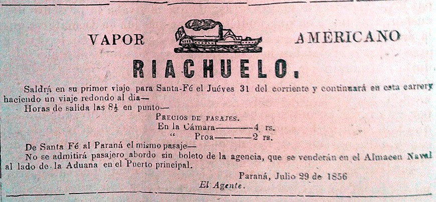 A partir del decreto del 4 de enero de 1854 que organiza el servicio de correos en todo el país, y se establece un vínculo diario entre la capital de la Confederación y Santa Fe. Poco después de la creación de los correos, escribe Pérez Colman, el ingeniero Allan Campbell presenta al gobierno una propuesta para establecer un servicio diario, con embarcaciones a vapor, entre las citadas ciudades. Similar propuesta es la de José de Buschental para organizar un servicio de comunicaciones entre Paraná y Montevideo con escalas en puertos intermedios. Por la misma época el hombre de negocios santafecino José Iturraspe hace una propuesta de servicio diario de vapores entre Paraná y Santa Fe, con un buque para sesenta pasajeros. El periódico El Nacional Argentino, publicita el 29 de julio de 1856 el servicio entre ambas ciudades del vapor Riachuelo “que sale en su primer viaje a Santa Fe el jueves 31 del corriente y continúa en esta carrera haciendo un viaje redondo al día”.