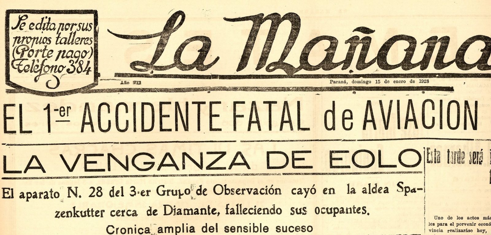 En la base aérea militar, inaugurada en Paraná en mayo 1927, se registra el primer accidente de aviación que es también el primero producido en la provincia. Resultan víctimas el teniente aviador Efraín Rivero Olazábal y el sargento mecánico Juan Gil Valdez. El avión se precipita a tierra, a las 9 y 50, cuando se encuentra realizando un vuelo de servicio en las proximidades de la aldea Spatzenkutter, departamento Diamante.
