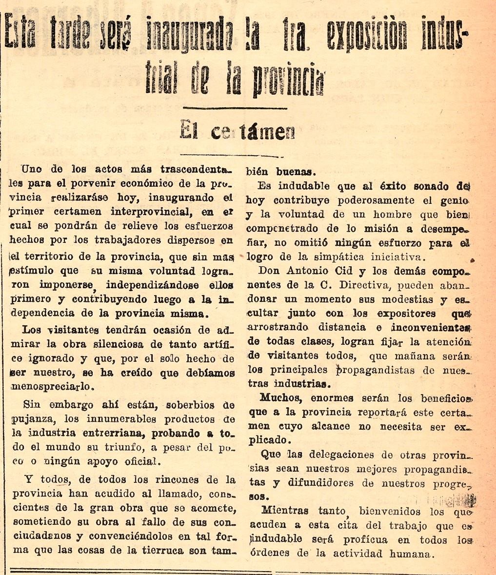 La Exposición Industrial de la Provincia es organizada por la Asociación Industrial de Paraná, que años antes había realizado una de carácter similar pero exclusivamente local, y que años después efectúa otra denominada Exposición del Litoral, donde se exponen productos de Corrientes, Entre Ríos, Santa Fe, Chaco, Formosa y Misiones, todo por iniciativa del industrial Antonio Cid, presidente de aquella entidad.