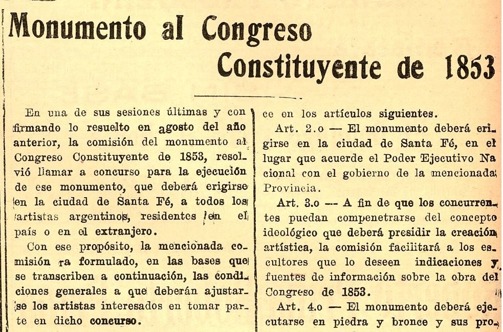El diario La Mañana publica el llamado a concurso para la erección de un monumento al Congreso Constituyente de 1853, a erigirse en la ciudad de Santa Fe. El mismo viene a cumplir con las disposiciones de la ley Provincial 1.180 de 1902 y la nacional 11.327, del 30 de julio de 1925. Evidentemente el mismo no llega a concretarse ya que en 1943 recién se coloca la piedra fundamental que no tiene mayor avance. En 1959 la legislatura santafesina aprueba una nueva ley que ordena su ejecución. En 2008 el gobierno de la ciudad de Santa Fe vuelve a insistir en el proyecto y finalmente el 2012 se inician las obras, inaugurándose la primera etapa el 2 de mayo de 2014.