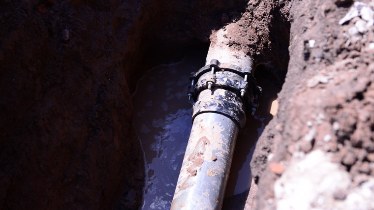 Personal de la Municipalidad ejecuta esta mañana de lunes el arreglo de un conducto de 150 milímetros en Avenida Almafuerte, en el tramo comprendido entre calles Carlos Mastronardi y Salvador Caputo.