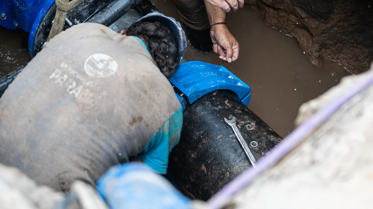 Personal municipal trabaja en calles Lothringer y Ursini colocando una válvula en la red distribuidora de agua en la vecinal San José Obrero. Por otro lado, reparan una cañería en calle Moussy.