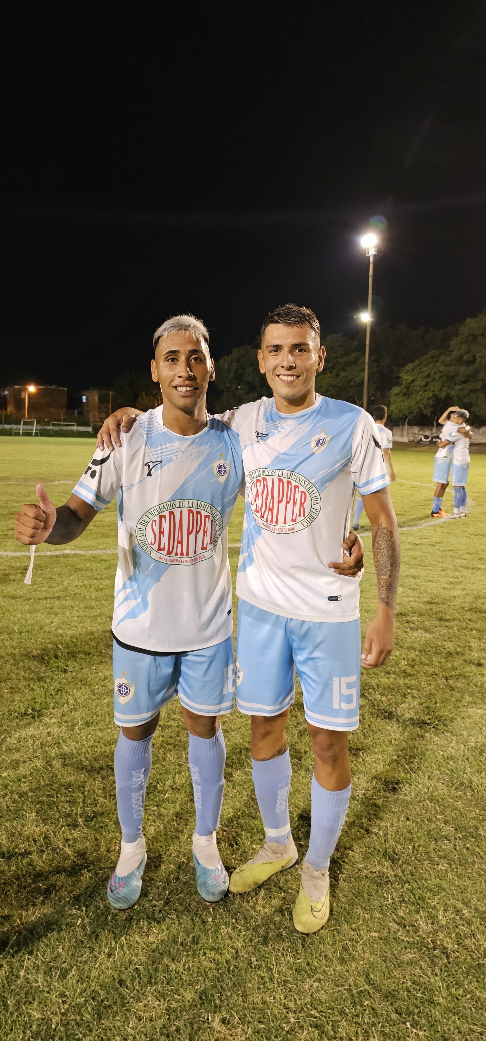 Los goleadores de Don Bosco ante Sarmiento, Francisco Giaccio y Nicolás Godoy, posaron para la foto tras la victoria en la fecha inaugural.