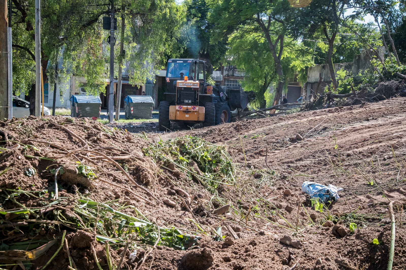 El operativo del terreno ubicado en la esquina de Urquiza y Cura Álvarez comenzó el jueves y continuó el viernes, ya que implicó el derribo de estructuras con peligro de derrumbe, desmalezado, poda de árboles secos y limpieza de todo el terreno.