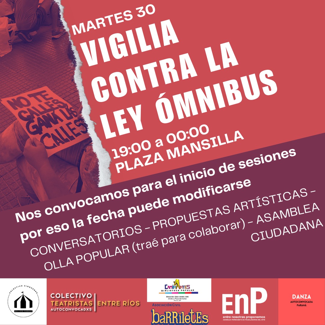 Mañana martes 30 de enero a las 19:00 distintas organizaciones invitan a participar de la Vigilia contra la ley ómnibus donde habrá conversatorios, propuestas artísticas, olla popular y asamblea ciudadana. La fecha está sujeta a modificaciones si el día del inicio de sesiones se cambia.