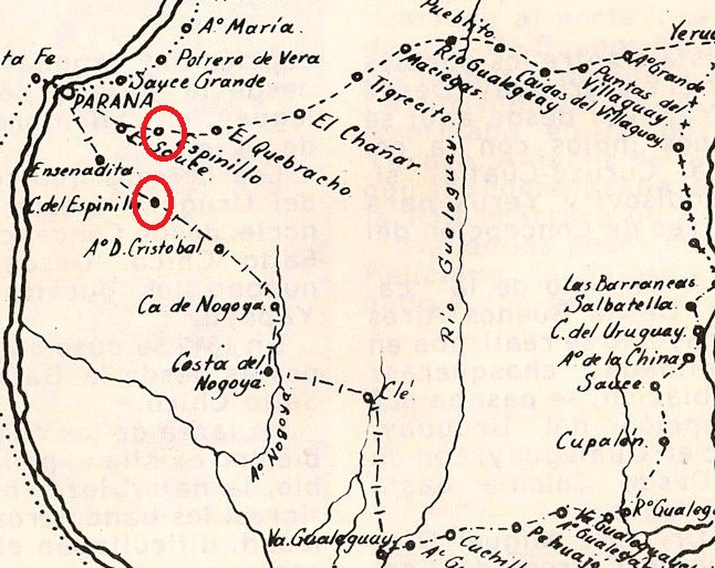 Las dos últimas son las que nos interesan. La carrera que parte rumbo a Yeruá cuenta con las postas de El Sauce (en los alrededores de lo que hoy es Sauce Montrul), Espinillo, y las subsiguientes. Esta última es la que actualmente está como el sitio del combate. Pero la carrera de Paraná a C. del Uruguay también contaba con las postas de la Ensenadita, Cuchilla del Espinillo y las siguientes que justamente es el derrotero que siguió Holmberg con sus tropas cuando el 11 de febrero parte a Nogoyá para encontrarse con Pintos Carneiro.