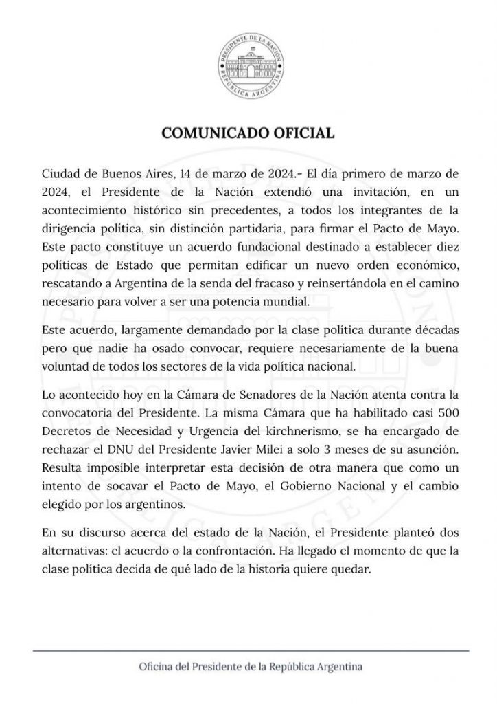 Milei cerró el comunicado con críticas a la oposición al señalar: “Resulta imposible interpretar esta decisión de otra manera que como un intento de socavar el Pacto de Mayo, el Gobierno Nacional y el cambio elegido por los argentinos”.