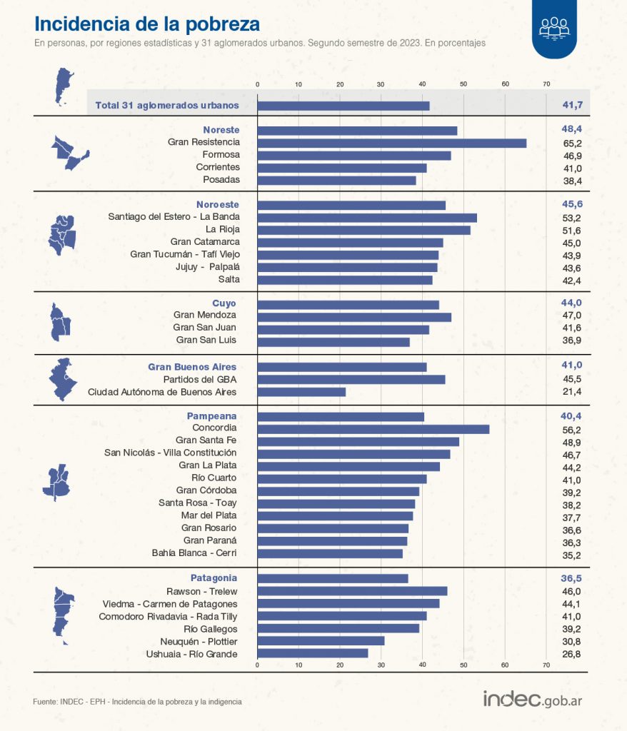 La región con mayor incidencia de la pobreza en personas durante el 2° semestre de 2023 fue el Noreste (48,4%); y la de menor, la Patagonia (36,5%)