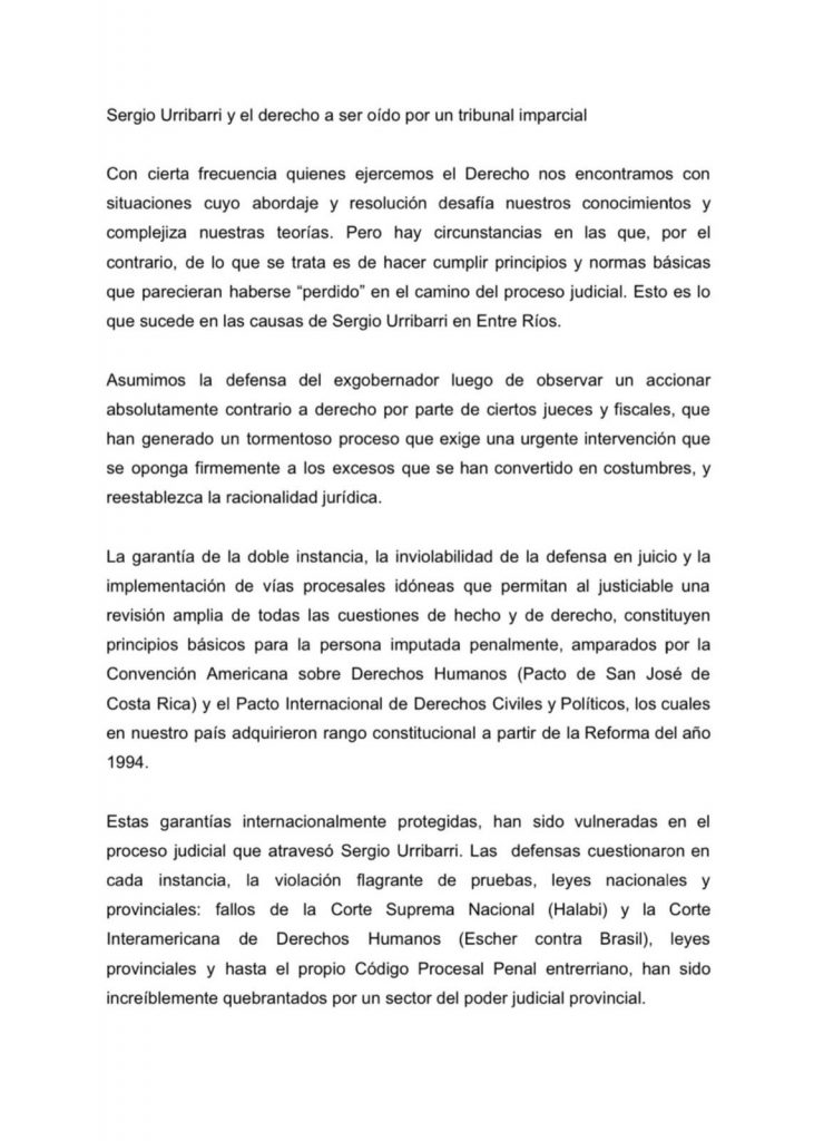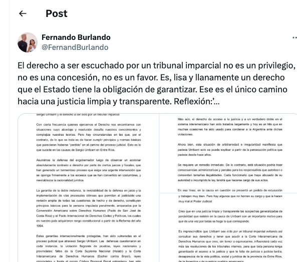 Fernando Burlando el abogado del ex gobernador de Entre Ríos solicitó que Sergio Urribarri tenga la posibilidad de ser oído por un tribunal imparcial, según destacó en un posteo de su cuenta X