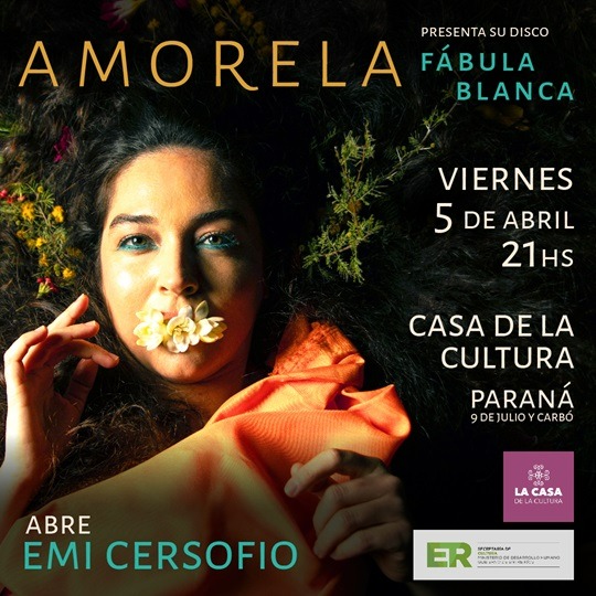 Hoy a partir de las 21, Amorela presenta el disco Fábula Blanca. Abre: Emilia Cersofio. Será en La Casa de la Cultura (9 de Julio y Carbó). Anticipadas $2500 al WhatsApp 3424361803. En puerta $3.000.