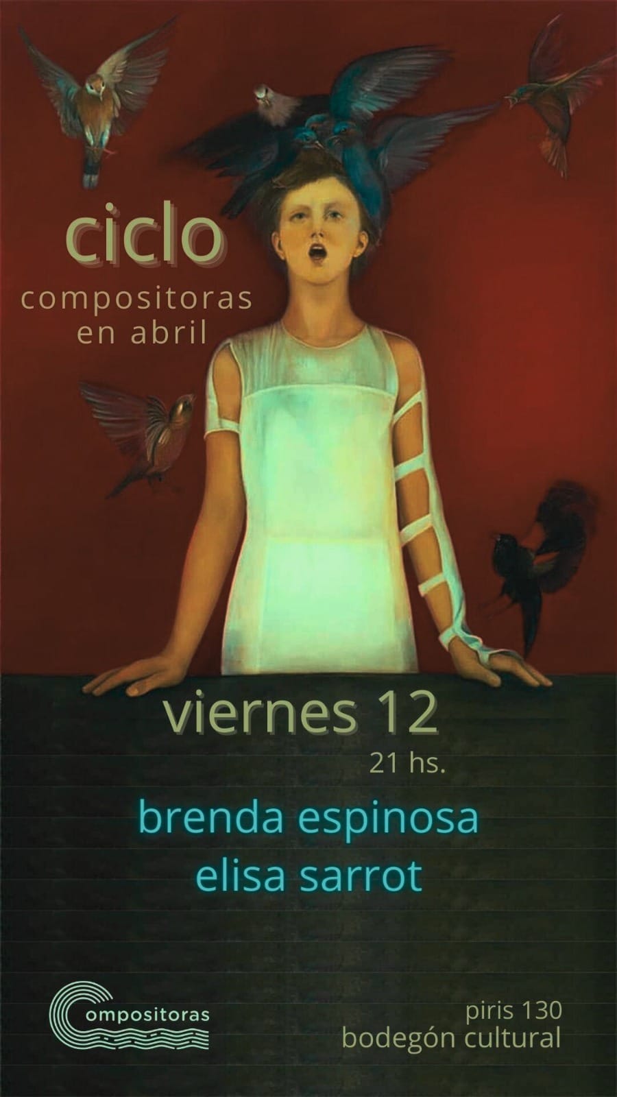 El próximo viernes 12 a las 21, una nueva jornada del Ciclo Compositoras. Se presentarán Brenda Espinosa y Elisa Sarrot. Será en el Bodegón Cultural (Piris 130). Entrada $4000. Reservas al 3755648406.