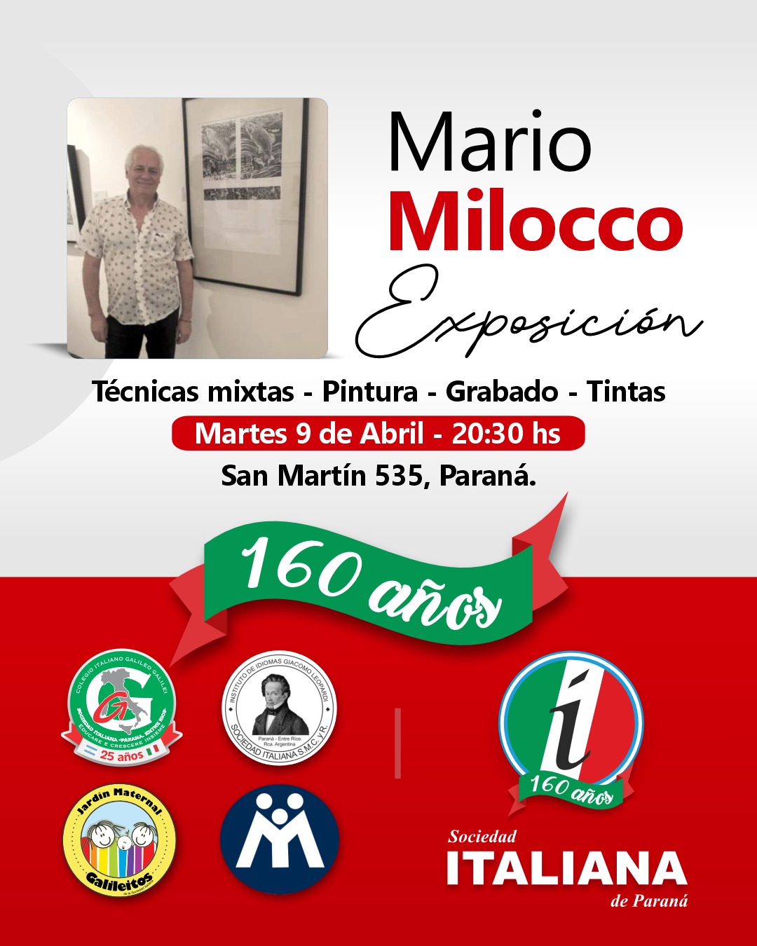 En el salón de la Sociedad Italiana de Socorros Mutuos Cultural y Recreativa de Paraná, en el marco de los festejos por su 160 Aniversario, quedó expuesta la muestra del artista visual Mario Milocco en San Martín 535 de la ciudad de Paraná.