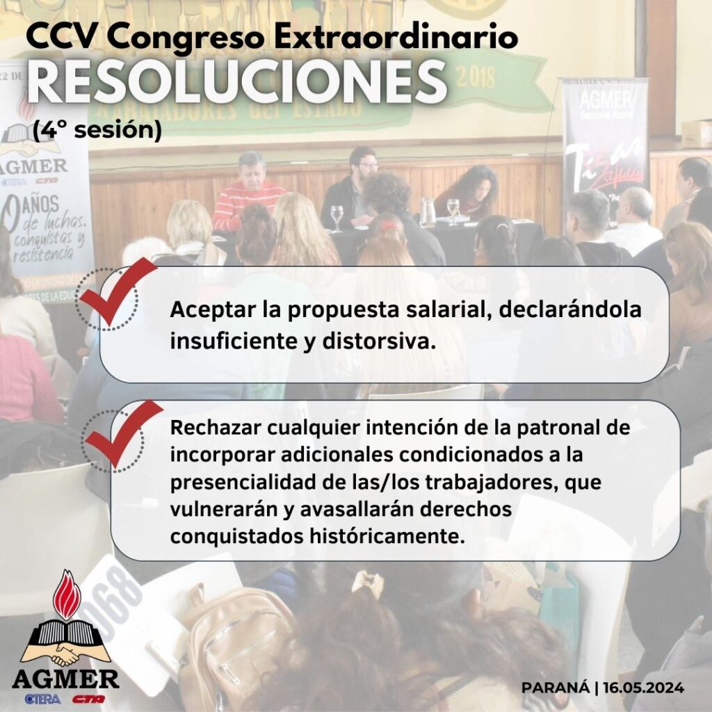 El Congreso Extraordinario de AGMER deliberó este jueves en Paraná en el salón de ATE, con participación de congresales de todos los departamentos y resolvió:
