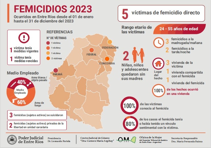 En Entre Ríos, durante 2023 se registraron 5 causas judiciales como femicidios directos. De las víctimas, dos integran el grupo etario de 35 a 44 años; uno al de 18 a 24 años; otro al de 25 a 34 y otro al de 45 a 59 años de edad.