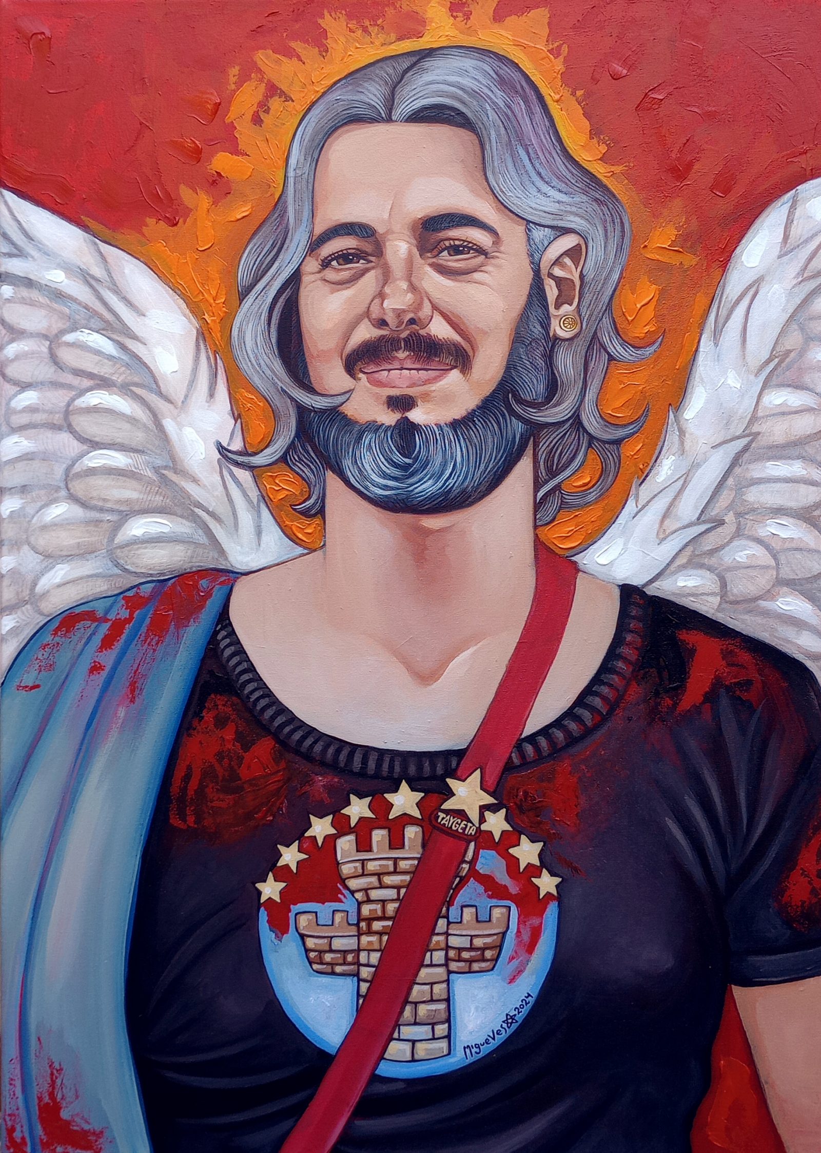 -Claro, mi mundo interior. Casi siempre mi obra habla de ese universo interno. De los temas que me apasionan; de dioses, del tarot; de la vida extraterrestre; de ciertos mitos. En esta muestra presento retratos de 21 actrices de películas que he estado viendo de los años 70. Son mujeres emblemáticas. Las que más me movilizan; una especie de musas para mí. Por ejemplo, mi principal inspiradora se llama Margit Carstensen, una artista alemana de las películas del director Rainer Werner Fassbinder. Ella me genera una fascinación importante. También, de otras películas aparecieron Catherine Deneuve, Fanny Ardant, Magdalena Montezuma, que también es otra actriz alemana. Después de Argentina elegí a Graciela Duffau, a Graciela Borges. Bueno. Y otras estrellas de películas de distintos directores de Estados Unidos y Alemania. También incluí en la muestra un autorretrato principal. A él sumo representaciones mías a través de deidades vinculadas a distintas tradiciones espirituales y mitológicas. Creo que eso me permite mostrar mi yo espiritual a través de personajes como por ejemplo el Arcángel Miguel, Santa Bárbara, la diosa Hera -que siempre aparecen en mi pintura-, y que esta vez van a estar como protagonistas.