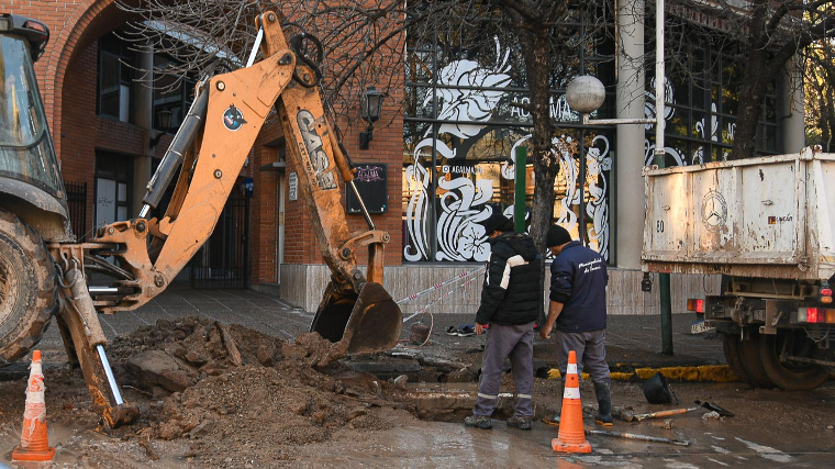 Trabajadores de la Subsecretaría de Obras Sanitarias realizan allí trabajos en cañerías del sistema de distribución del suministro.