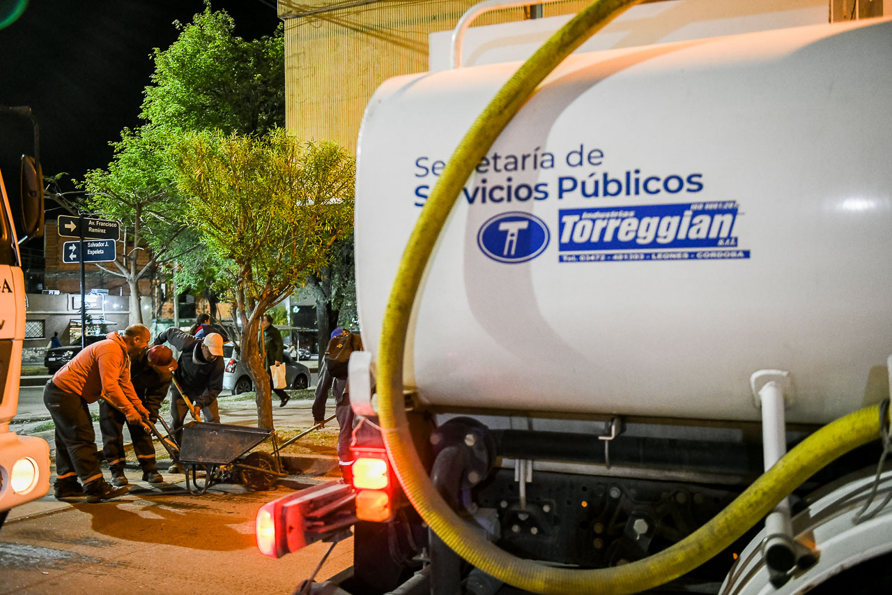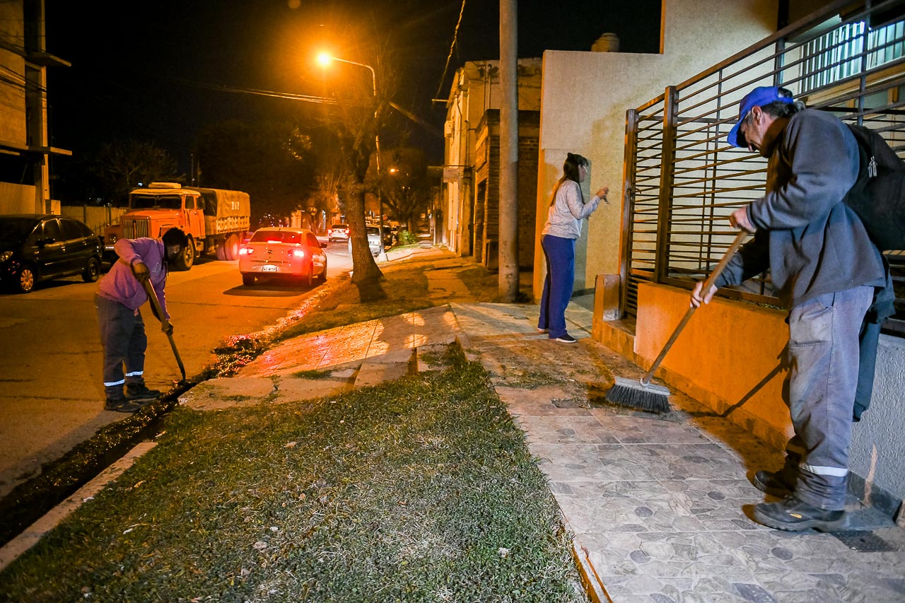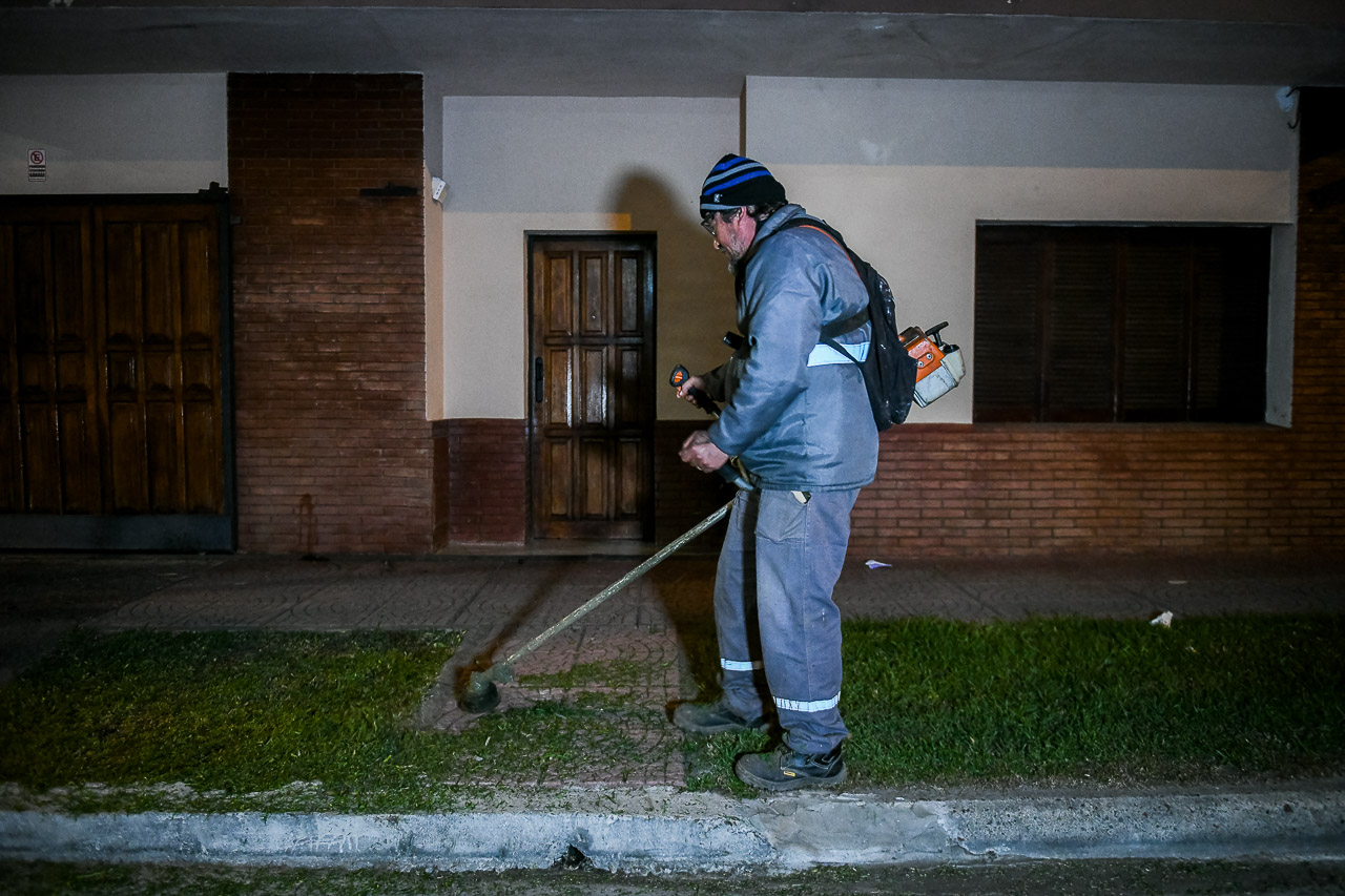 Durante las intervenciones nocturnas se hacen diferentes tareas como desmalezado, mantenimiento de desagües pluviales y lavado de calles con camiones hidrantes. También se realiza un relevamiento de la iluminación con el equipo de Alumbrado Público para reforzar los lugares donde hay inconvenientes para mejorarlos en los días siguientes.