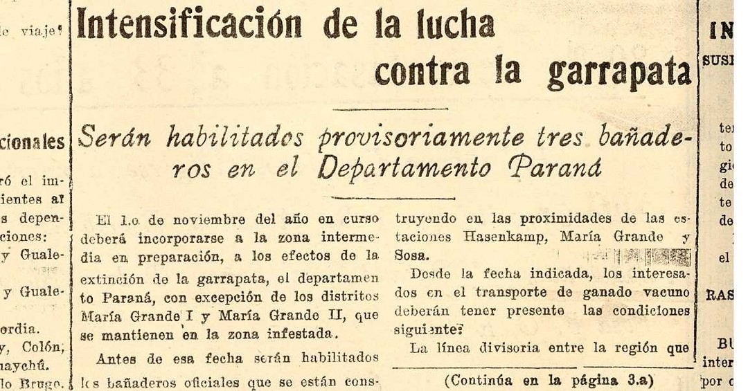 El diario La Mañana informa sobre la campaña de lucha contra la garrapata en varios distritos del departamento Paraná, con la habilitación de tres bañaderos de animales.
