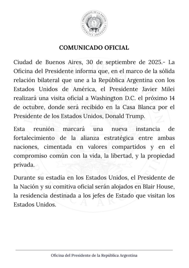 “La Cancillería de la República Argentina informa que, como muestra de la excelente relación bilateral que une a la República Argentina y a los Estados Unidos de América, el próximo 14 de octubre el Presidente de la Nación, Javier Milei, realizará una visita oficial a los Estados Unidos y tendrá el honor de ser recibido en la Casa Blanca por el Presidente Donald J. Trump”, indicó el Gobierno argentino.