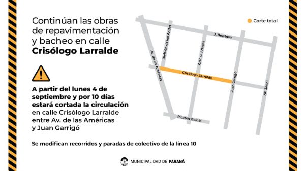 Por Redacción12 septiembre, 2023Desde la Municipalidad informaron que a partir de hoy 4 de septiembre y por 10 días estará cortada la circulación en calle Crisólogo...